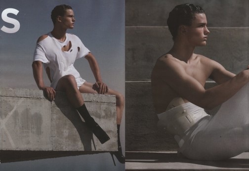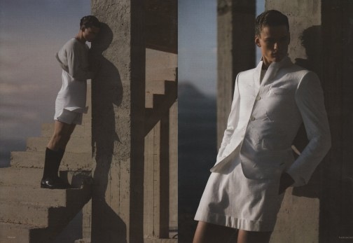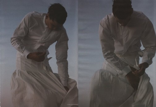 If you thought no man would wear the creations from the Romain Kremer SS09 I showed you a couple weeks ago in my WTF post, you were wrong. Check out the hunky Simon Nessman wearing the white sheer dress from that collection in a new editorial in Tokion by photographer Rene Habermacher. Somehow Simon manages to carry off the piece, which is not an easy task. Check out more below where he is styled by Jason Farrar in more interesting pieces.