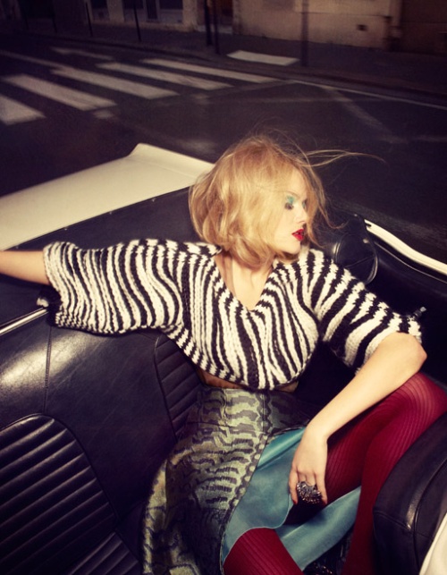 Hugo Sauzay and Olya Ivanisevic are ‘Living in a French Film’ in this eclectic editorial by photographer Marcus Ohlsson in the December 2009 issue of Italian Velvet magazine. Olya plays the role of the beautiful actress while Hugo Sauzay is the intense director/boyfriend. Olya eventually dumps him and goes around town on her own. Make sure to see the rest of the images after the jump.