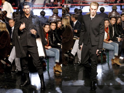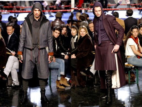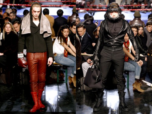 While it was difficult to pin down the inspiration behind the new John Galliano collection, it is easy to do so for Jean Paul Gaultier: boxing and rough sports. The models came out with their boxing gloves and bruised faces to show the designer's take on rough-chic. I thought the Dolce & Gabbana show was macho, but JPG has them beat.