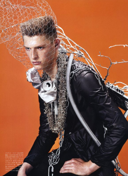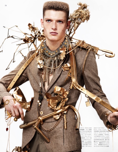 The new Vogue Hommes Japan cover boy, Julius Gerhardt, also stars in a creative editorial entitled 'Rebirth of Nature' by Josh Olins and Nicola Formichetti. Props by Andrea Cellerino. More after the jump.