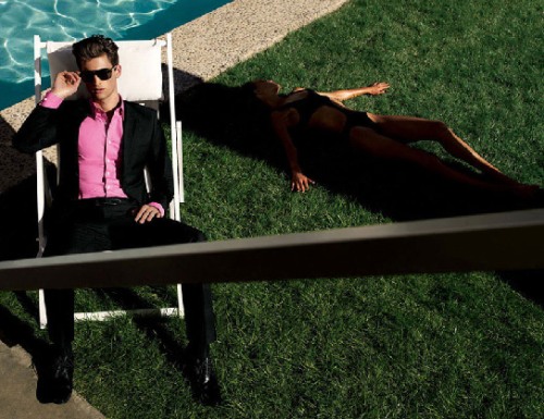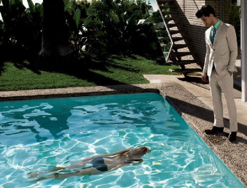 My all-time favorite item of clothing is a G2000 black blazer that I snagged from my brother. In addition to looking sharp, whenever I put it on, it shaved 10 kilos off. For their Spring/Summer 2010 ad campaign, G2000 enlisted models Garrett Neff and Iris Strubegger for a swimming pool themed shoot. More after the jump.