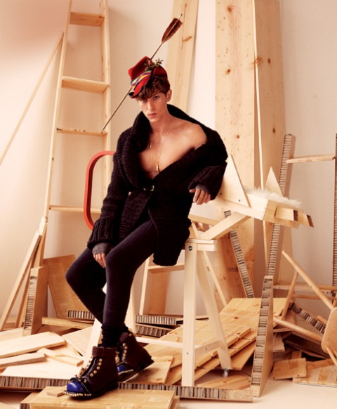While the cast of Shrek crashes into the upcoming 18th issue of VMAN, the real magic is ‘Once Upon a Time’ by Benjamin Alexander Huseby. Models Mathias Lauridsen and Rie Rasmussen get their fairy tale editorial with styling by Nicola Formichetti and a set that is designed by Gary Gard. More after the jump.