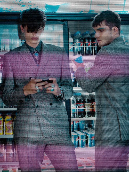 Photographer Jason Kim goes for a video screen cap aesthetic in his editorial ‘Walk the Walk, Talk the Talk’ in issue #51 of Blend magazine. Red models Jullien Herrera, Chris Swoszowski and Vali Cosa are styled by Sonny Groo in a mix of this fall’s denim and suits by the likes of Thom Brown, Agnes B., Simon Spurr, Tommy Hilfiger, Levis, Hugo, and G-Star.