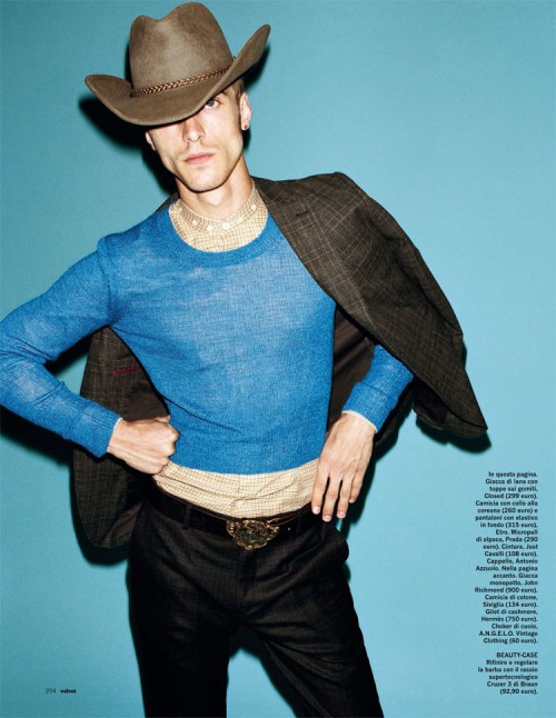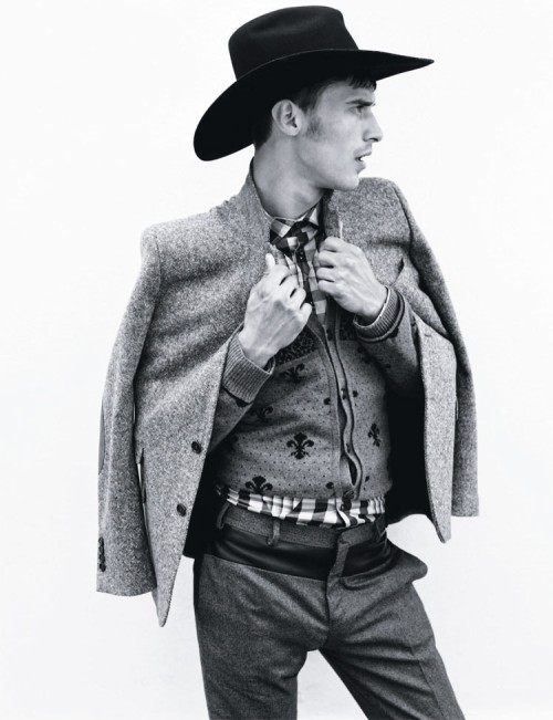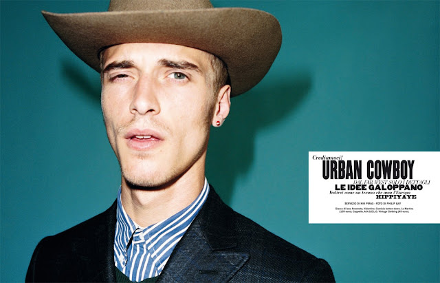 Clément Chabernaud goes wild wild west chic in the editorial 'Urban Cowboy' from a recent issue of Velvet magazine, photographed by Philip Gay and styled by Nik Piras with grooming by Javier Palacio.
