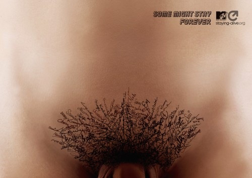 The showed us the sexual history of Madonna in one of their Staying Alive safe sex campaigns, and used retro porn images in another. Now, MTV is going down there and using pubic hair illustrations to showcase that when you have unprotected sex with people “Some might stay forever” with you. They do that by creating the illusion of pubic hair with the names of the different people you slept with.