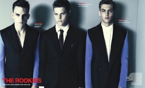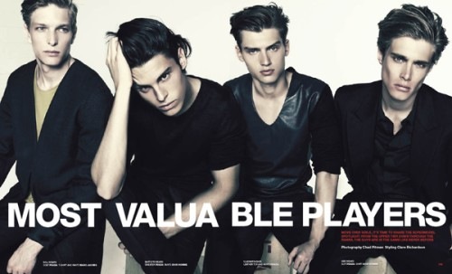 The featured models are Reid Prebenda, Tyson Ballou, Andres Velencoso Segura, Dennis Johnson, Garrett Neff, Baptiste Giabiconi, Petey Wright, CJ Hancock and Jake Madden, Gen Huismans, Ryan Kennedy, Vladimir Ivanov, RJ Rogenski, Brad Kroenig, Will Defiel, and Alex Lundqvist. Merci to Fashionisto.