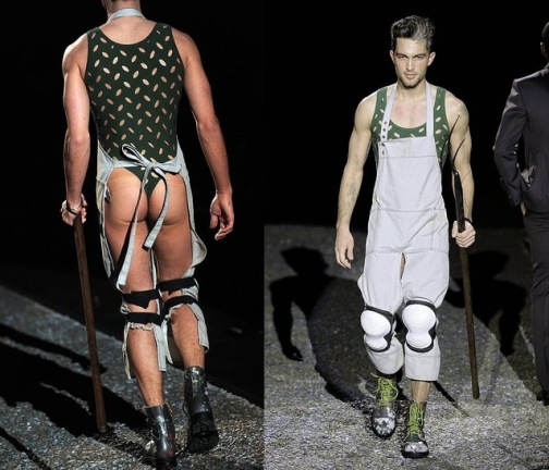 After recently using Gypsies in her SS09 show, Vivienne Westwood brings the farm boys to her men's fall/winter 2009 runway during the current Milan Fashion Week with a redneck-chic vibe. The overalls come with a surprise in the back. Who knew that a leotard with a constant wedgie up the man's ass would be fashionable. See the whole collection here.
